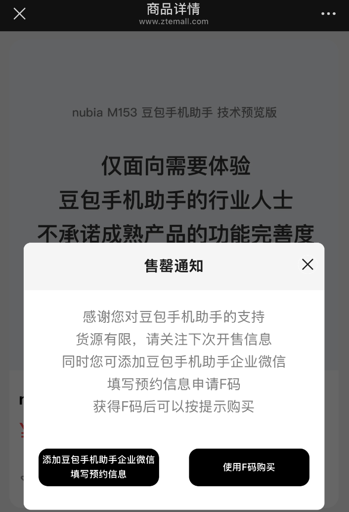 蓝鲸记者在中兴商城官网查询发现,目前该手机仅支持通过“F码”购买。用户需先进入预约页面,填写个人相关信息以申请F码,审核通过后方可获得购买资格。